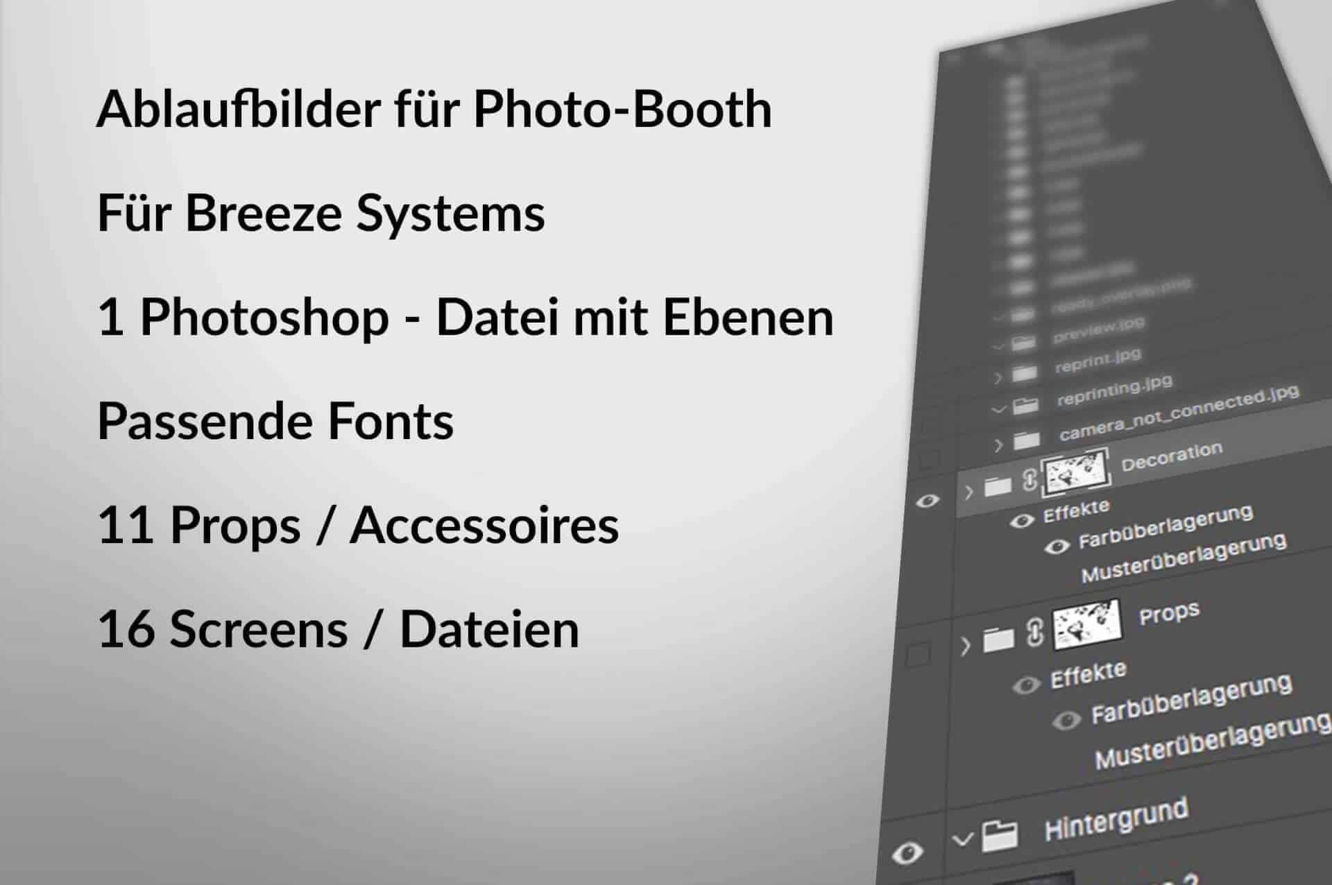Gestalte den Ablauf Deiner Photobooth und führe die Kunden & Nutzer professionell und gestylt durch das Menü. Verleihe Deiner Photobooth Stil und einen eigenen Look. Nutze dafür unsere Vorlagendatei für Ideen, Inspiration und Design. EINE Photoshop Datei *.PSD mit mehrere Ebenen- Einfache Verwaltung der eigenen Template
